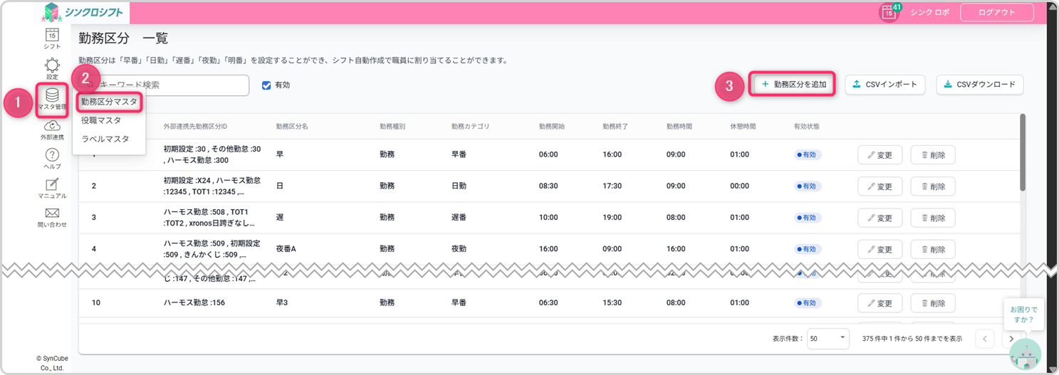 マスタ管理>勤務区分マスタページに移動します。「勤務区分を追加」ボタンをクリックします。