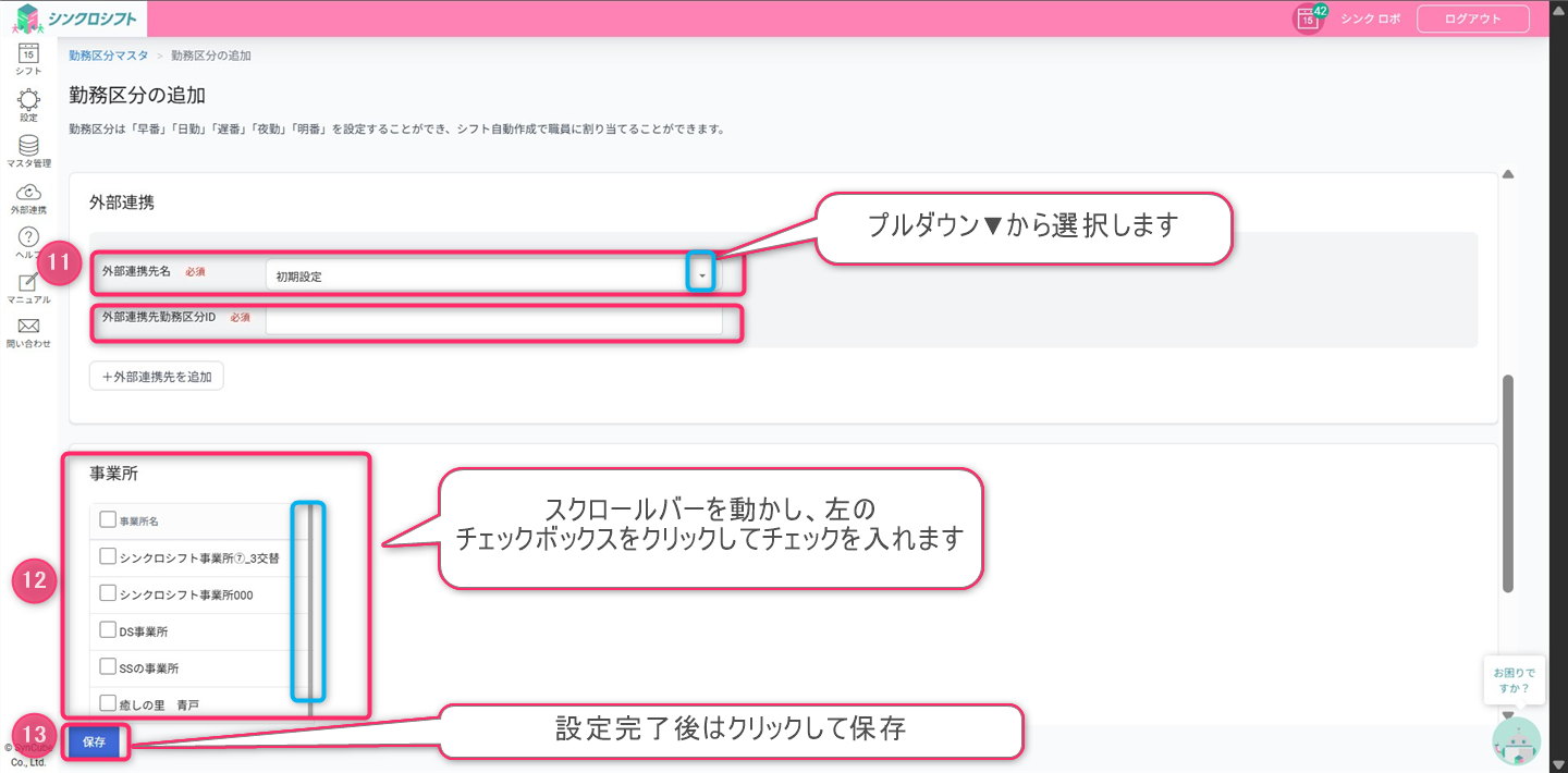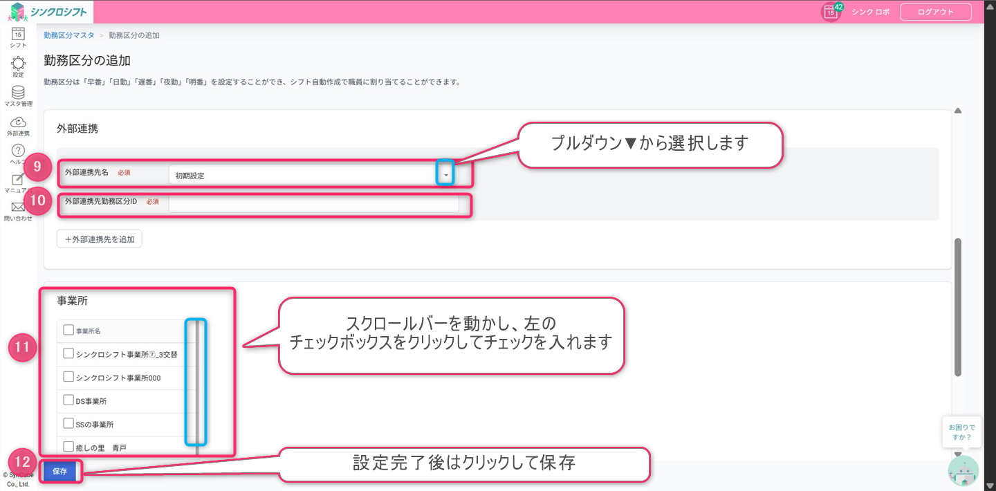 11.作成した勤務区分を適用する事業所にチェックを入れます。