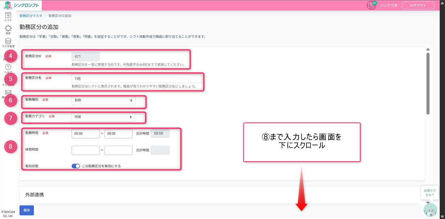 8.開始時間・終了時間は任意で設定します(※画像では、0:00-8:00としています)。有効状態で「この勤務区分を有効にする」をONにします。※休憩時間は、任意で設定します。