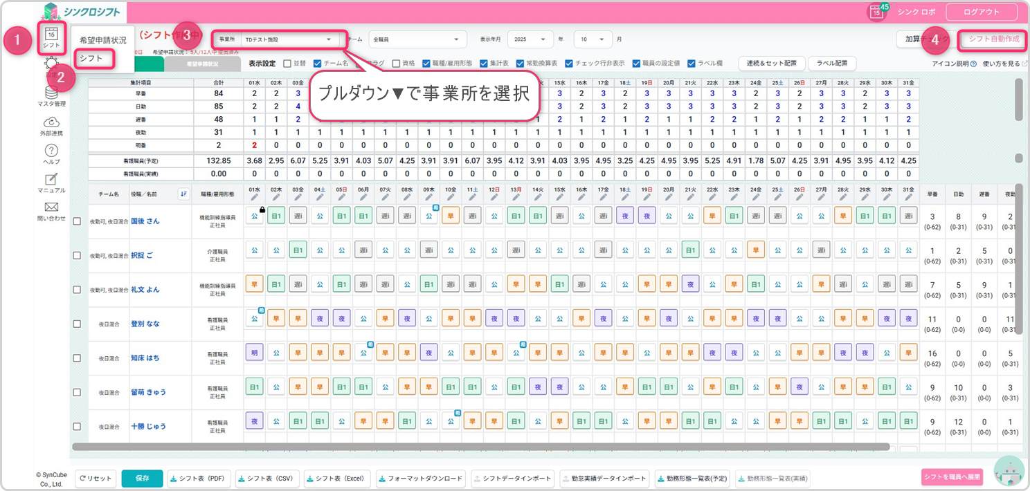 作成した夜勤と明番を職員に割り当てます。シフト自動作成画面などから設定することができます。