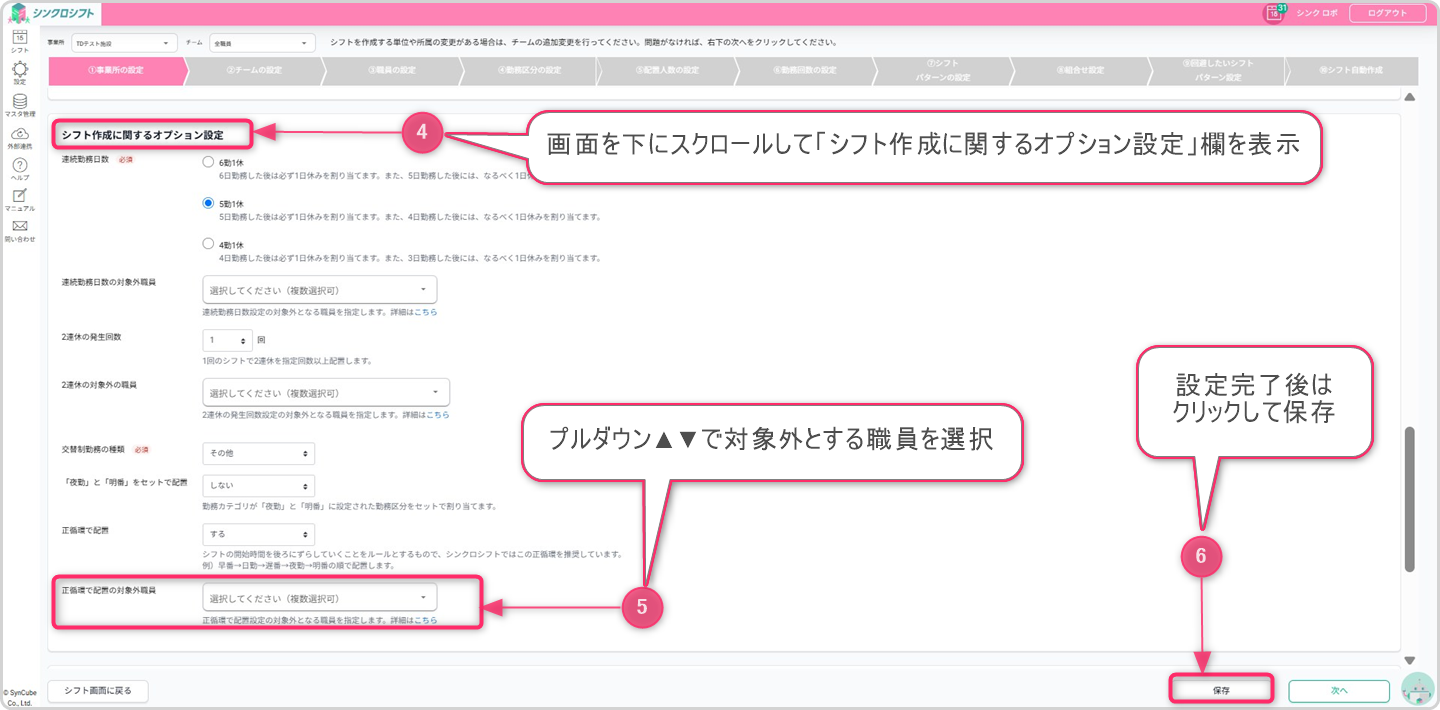 「正循環で配置の対象外職員」の項目で対象外とする職員をプルダウンから選び設定します。