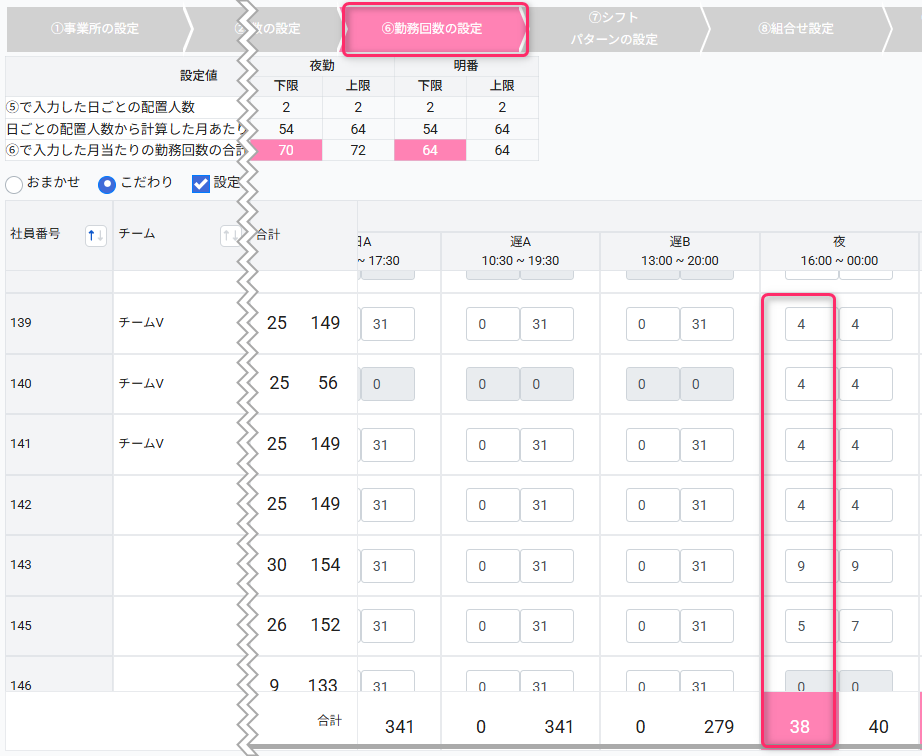 該当の勤務区分の「⑥勤務回数の設定」の下限値の見直しをお願いいたします。