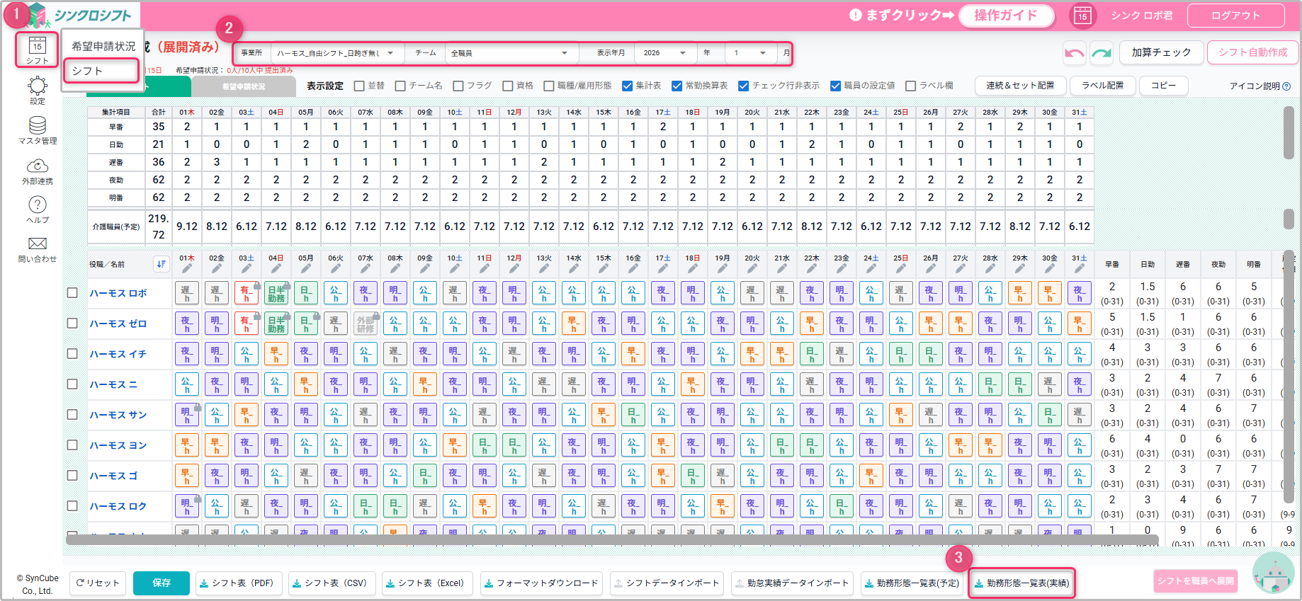 勤務形態一覧表の「実績」を作成する場合は、勤怠管理システムから勤怠・打刻情報をシンクロシフトへインポートする必要があります。