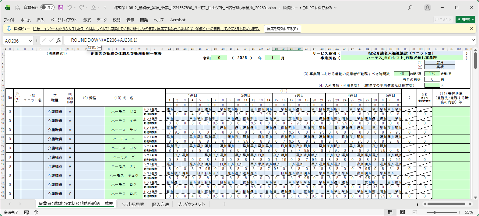 ⑥ファイルを開くと勤務形態一覧表が確認できます。