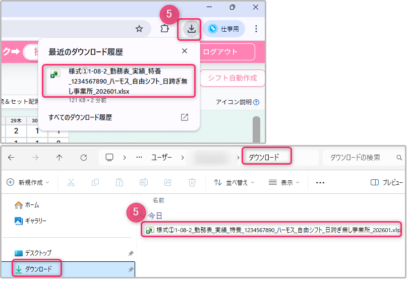 ⑤ダウンロードが完了すると、ブラウザのダウンロード履歴または、パソコンのダウンロードフォルダにExcelファイルを保存します。