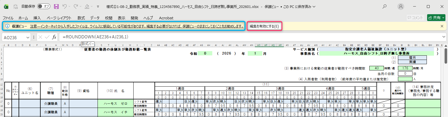 Excelファイル開いた際に、Excelの保護ビュー機能が表示されていると、勤務時間が反映してない場合があります。