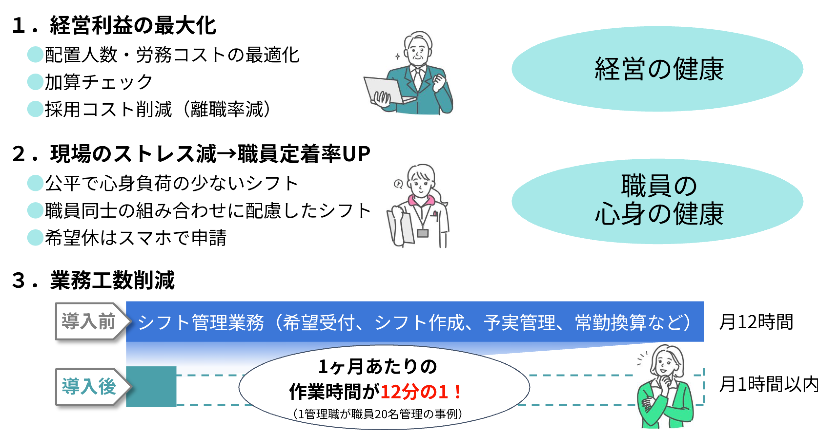 職員の定着率アップし経営効率(経営の健康)の上昇やシフト管理者様の負担減にも繋がります。