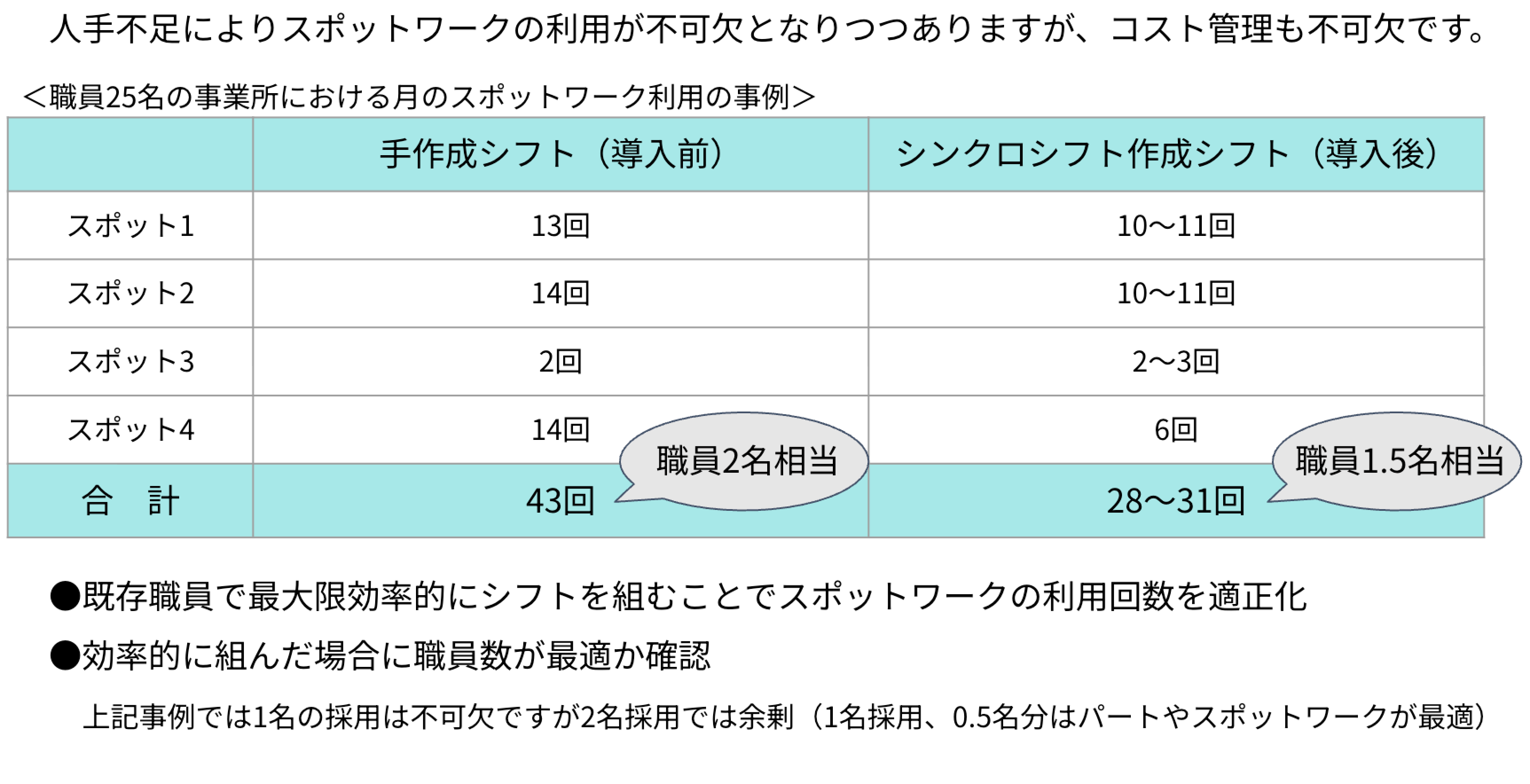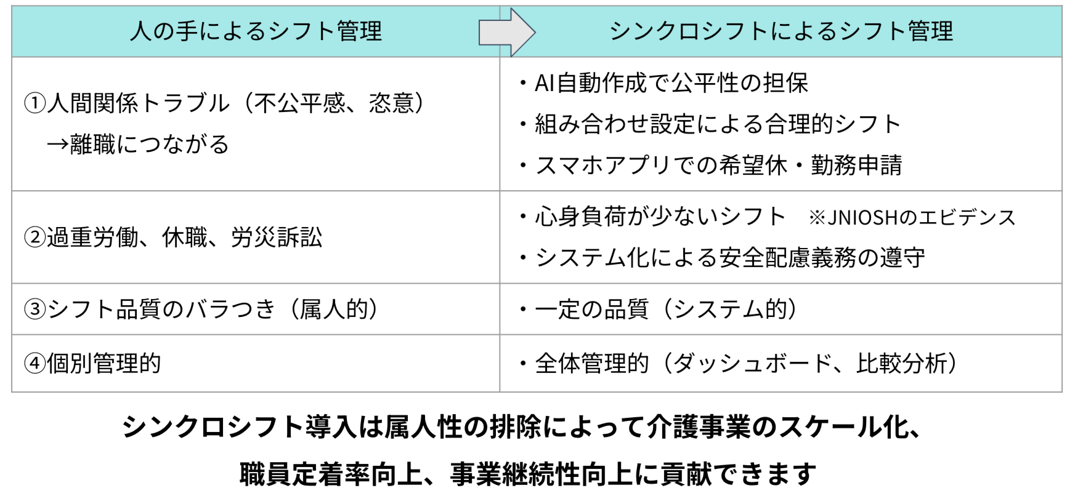 シフト管理から属人性を可能な限り排除することにより以下のメリットや問題解決ができます。