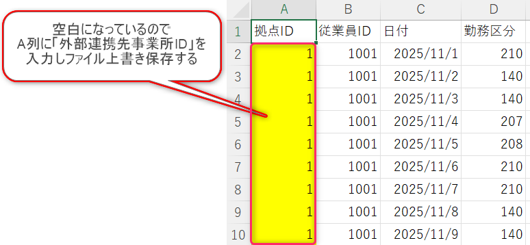 ダウンロードしたCSVファイルを開き、「拠点ID:A列」が空白になっていることを確認します。