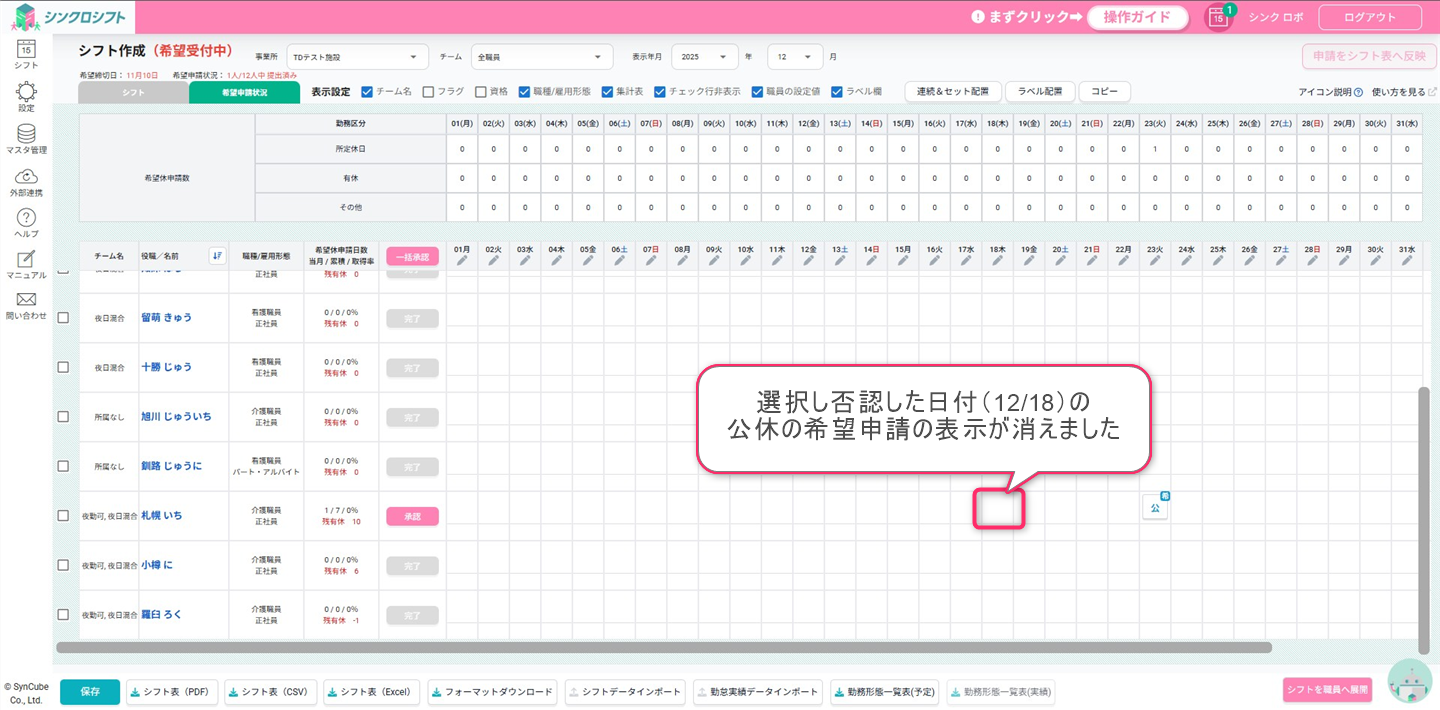 申請していた日付の希望シフトがカレンダー上から表示されなくなります。