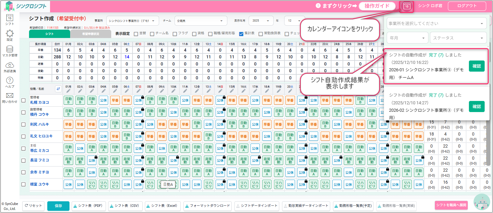 シフトの自動作成後、画面右上のカレンダーアイコンをクリックします。