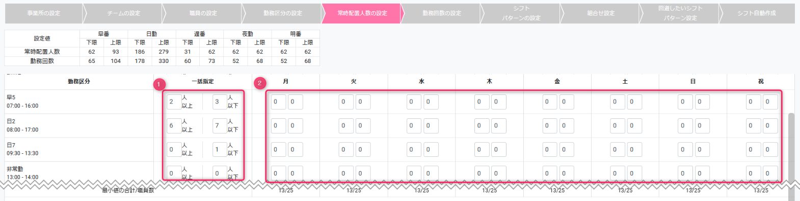 - 人数に基づく要件(例:利用者3人に対して職員1人以上など)
