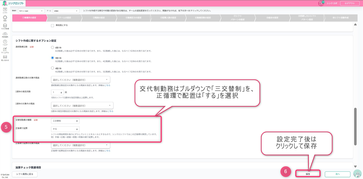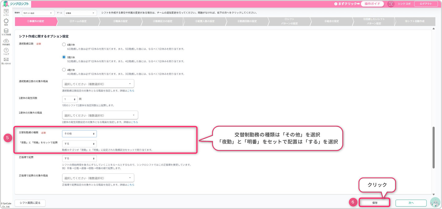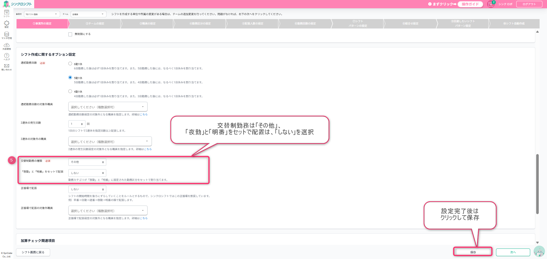 交替制勤務を「その他」に設定、「夜勤と明番をセットで配置」を「しない」に設定して保存します。