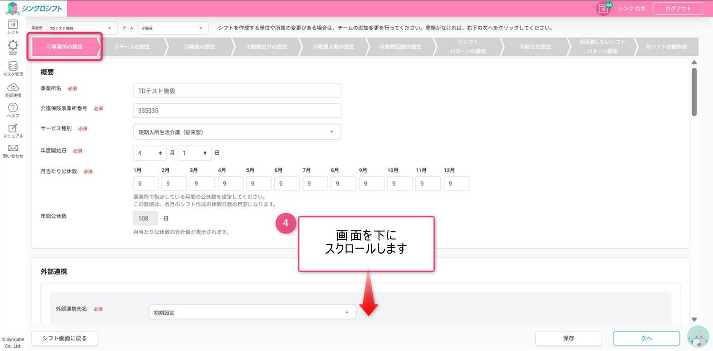 シフト自動作成ステップ「①事業所の設定」画面内で下へスクロールし「シフト設定に関するオプション設定」欄を表示します。