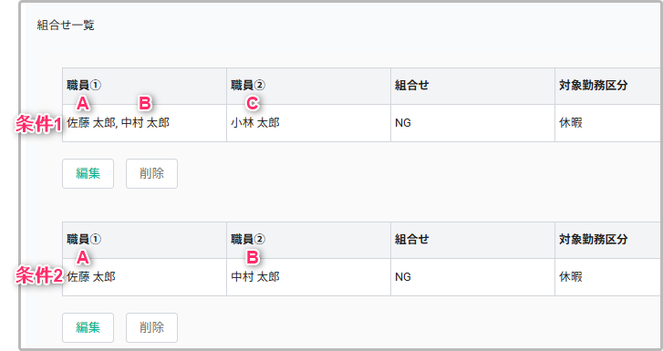 特定の職員同士を同じ勤務時間に配置したい(組合せOKの設定例)