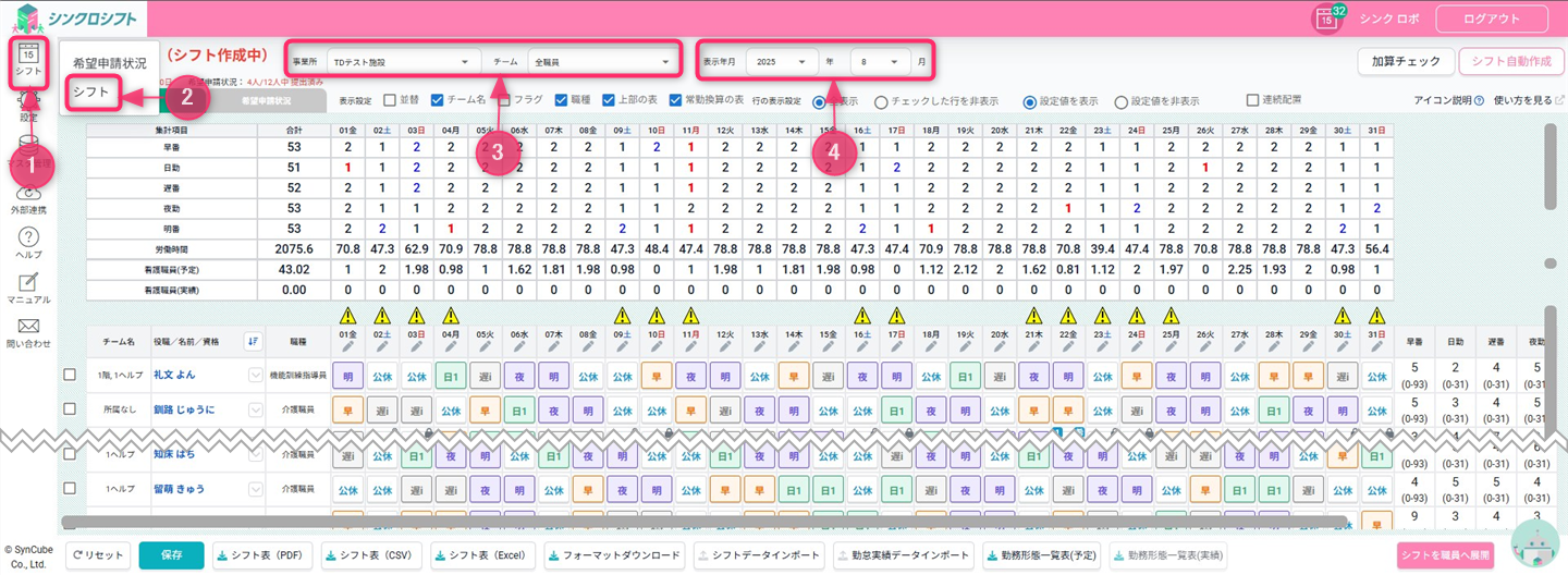 シンクロシフトでは、同一事業所内に兼務設定を行っている場合シフト表には同じ職員の名前が複数表示されます。