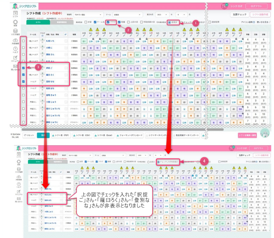 その様な場合や一時的に該当職員を非表示にしたい場合など、「チェックした職員の非表示」ボタンをクリックすることで職員を非表示にすることができます。