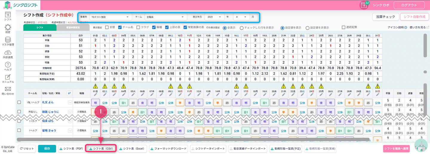 作成したシフト表はCSV形式(.CSV)でダウンロードでき、シフト画面に表示されている職員分のシフトデータを出力します。
