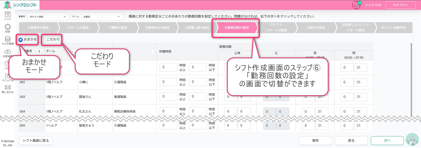 - こだわりモード:職員ごとに詳細な勤務回数を指定できるモード