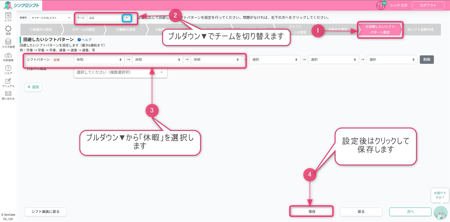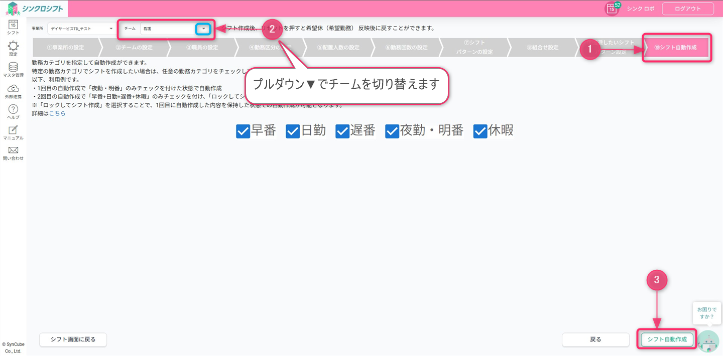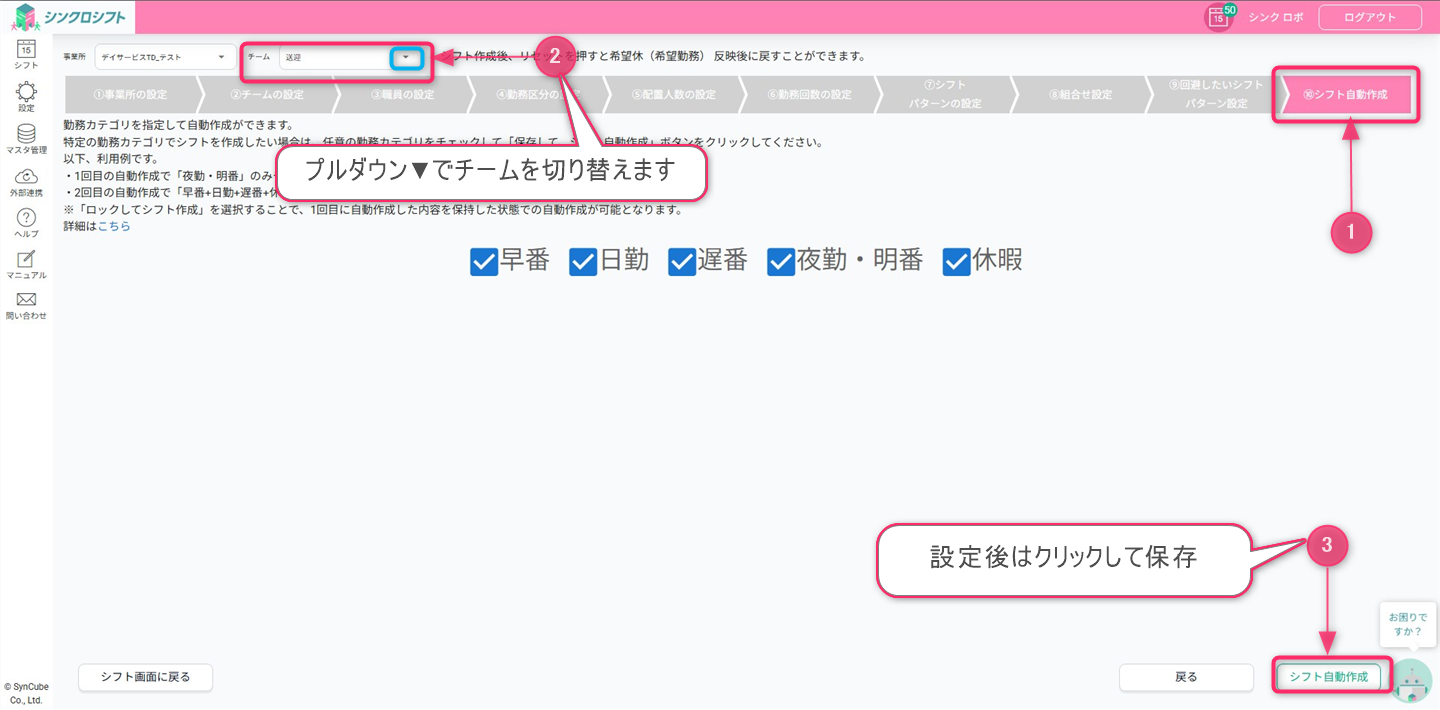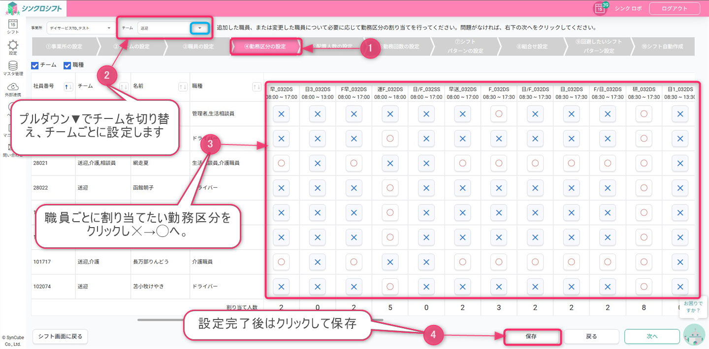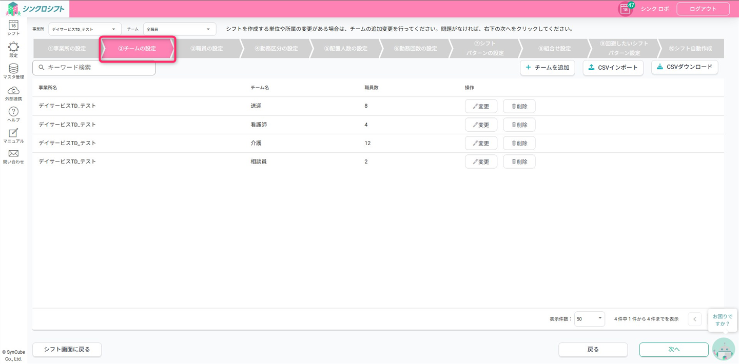 シフト自動作成ステップ「②チームの設定」で介護、看護、送迎、生活相談員など必要に応じたチーム作成をします。