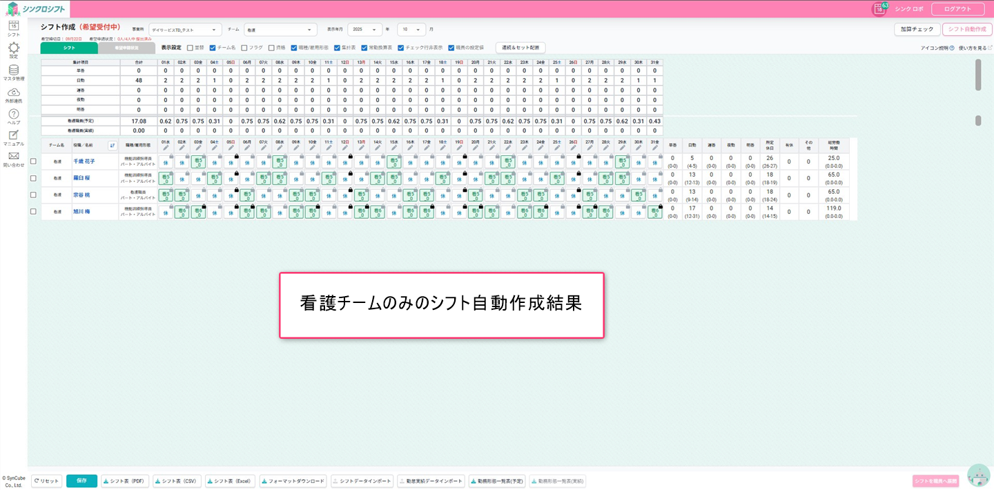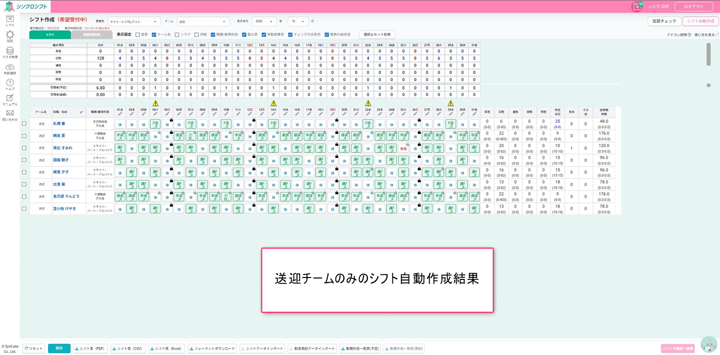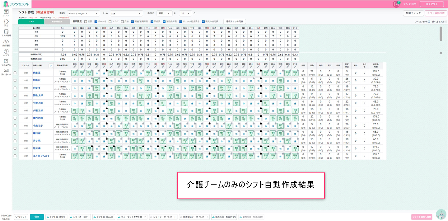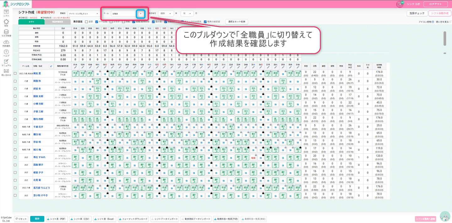 (4)シフト画面で「全職員」表示に切り替えて自動作成結果を確認します。