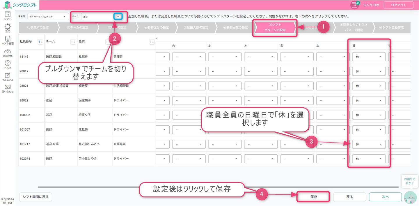 シフト自動作成ステップ 「⑦シフトパターンの設定」 で、職員全員を日曜休みに設定します。