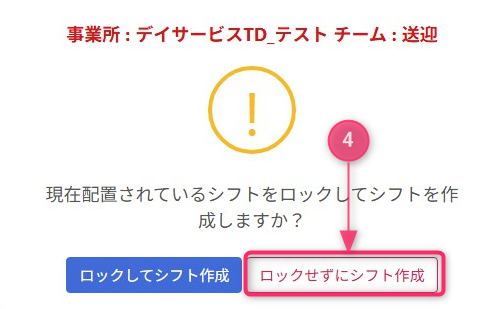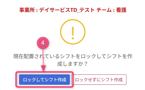 (2)と同様に自動作成ボタンをクリック後の確認画面では「ロックしてシフト作成」を選択します。