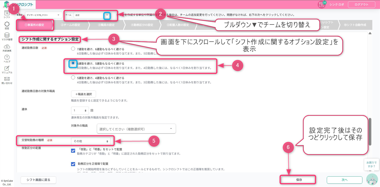 - 連続勤務日数:「6連勤を避け、5連勤もなるべく避ける(5勤務1休)」を選択