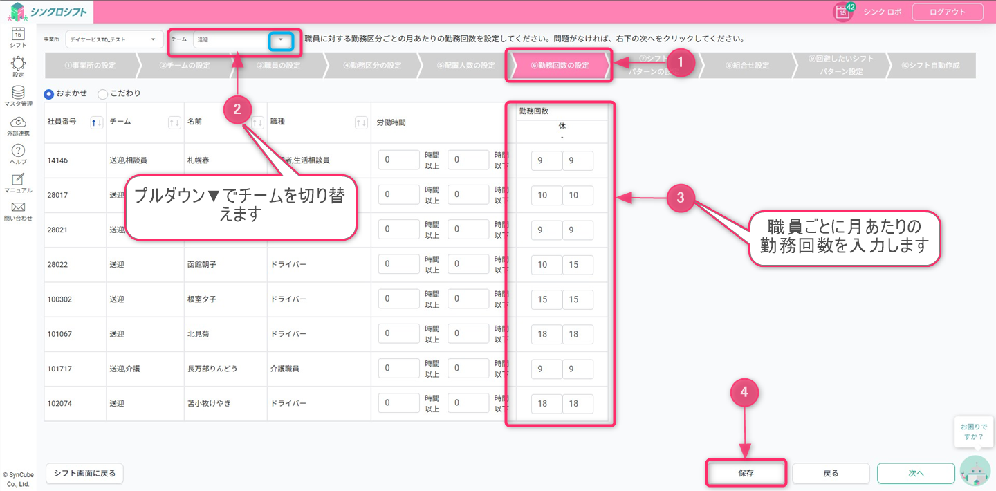 シフト自動作成ステップ 「⑥勤務回数の設定」 で、職員ごとの勤務回数を設定します。