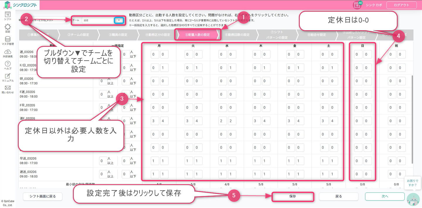 定休日(例:日曜日休業)がある場合は、その曜日の人数を「0-0」に設定してください。