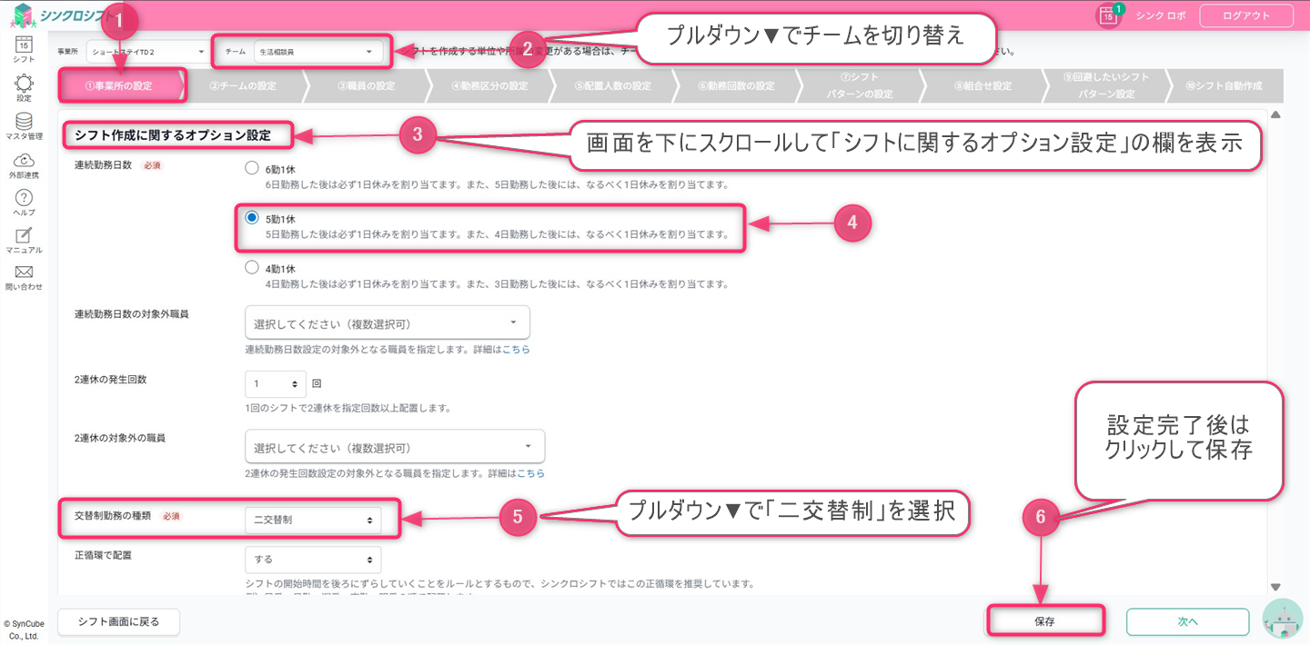 - 交替制勤務:2交替制を選択して保存します。