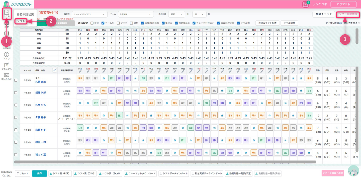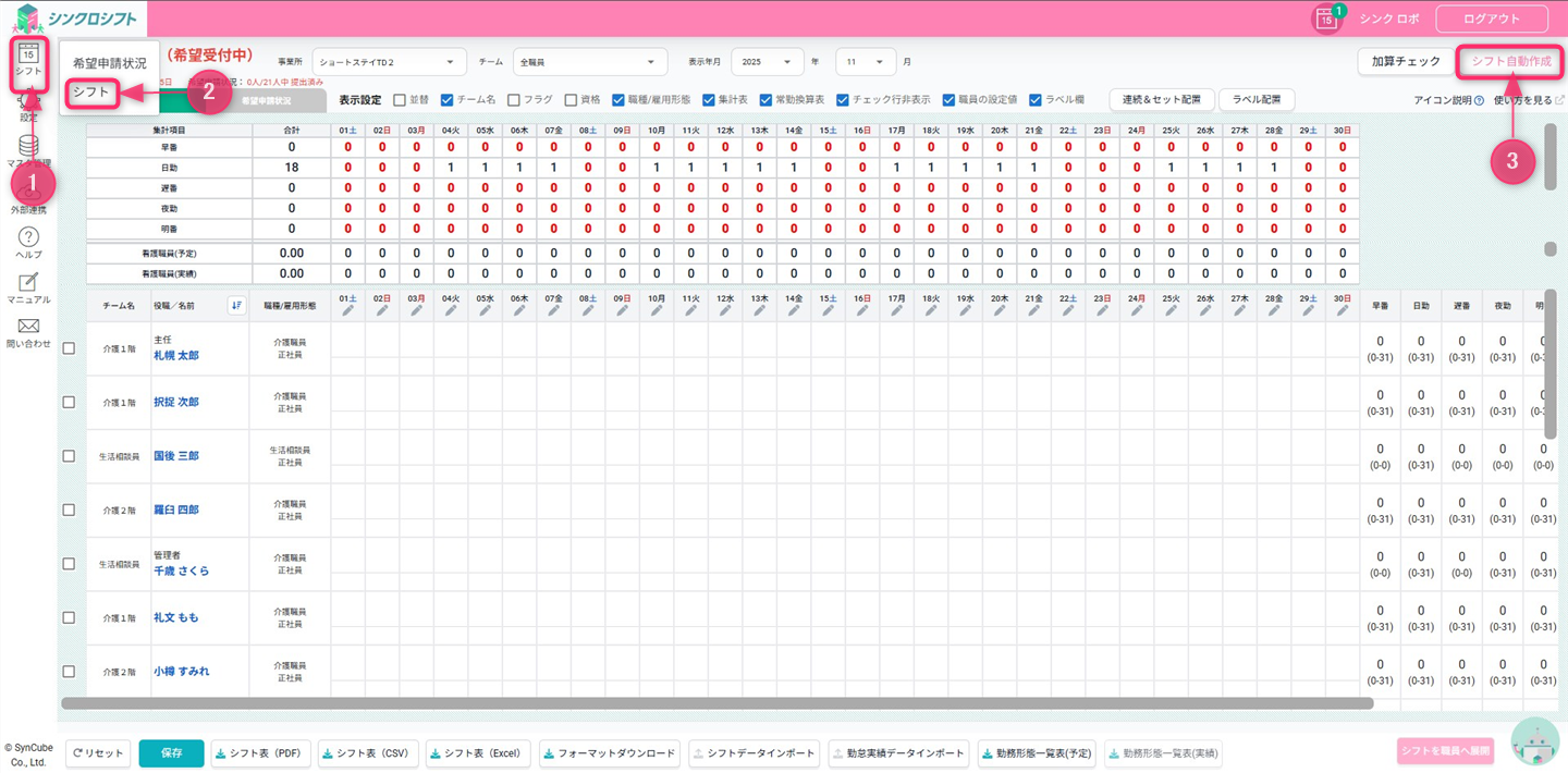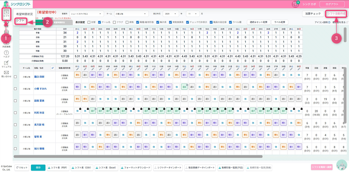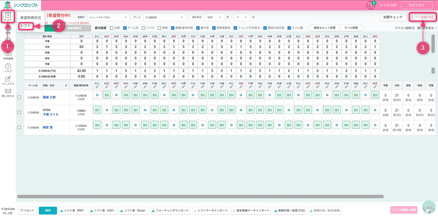シフト>シフト>シフト自動作成の順にクリックします。