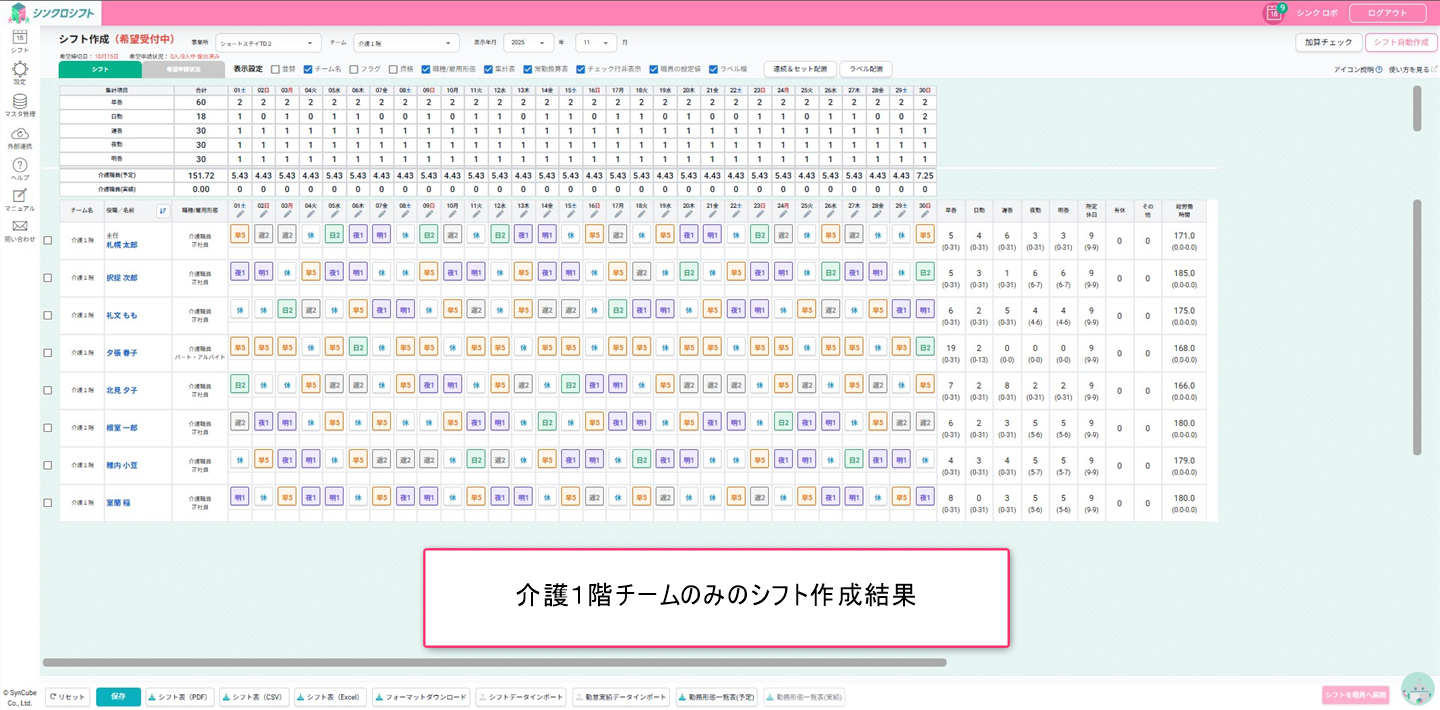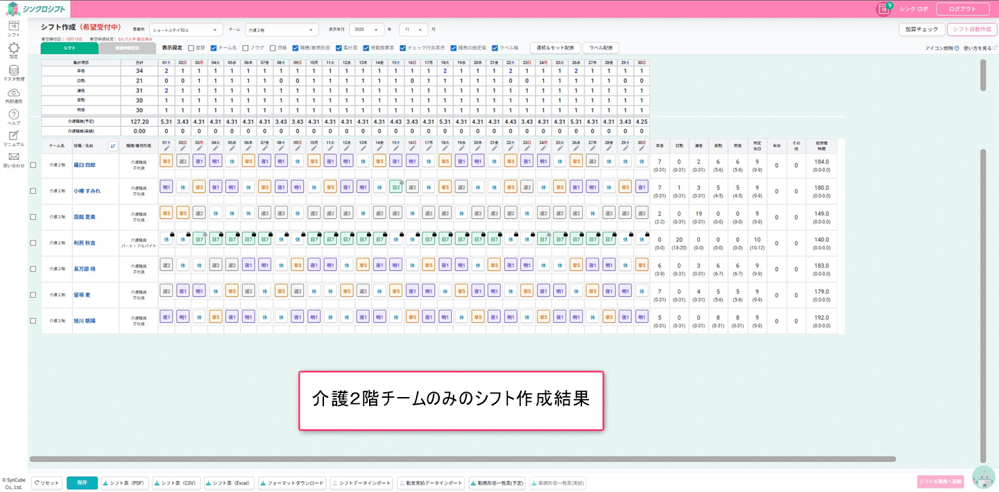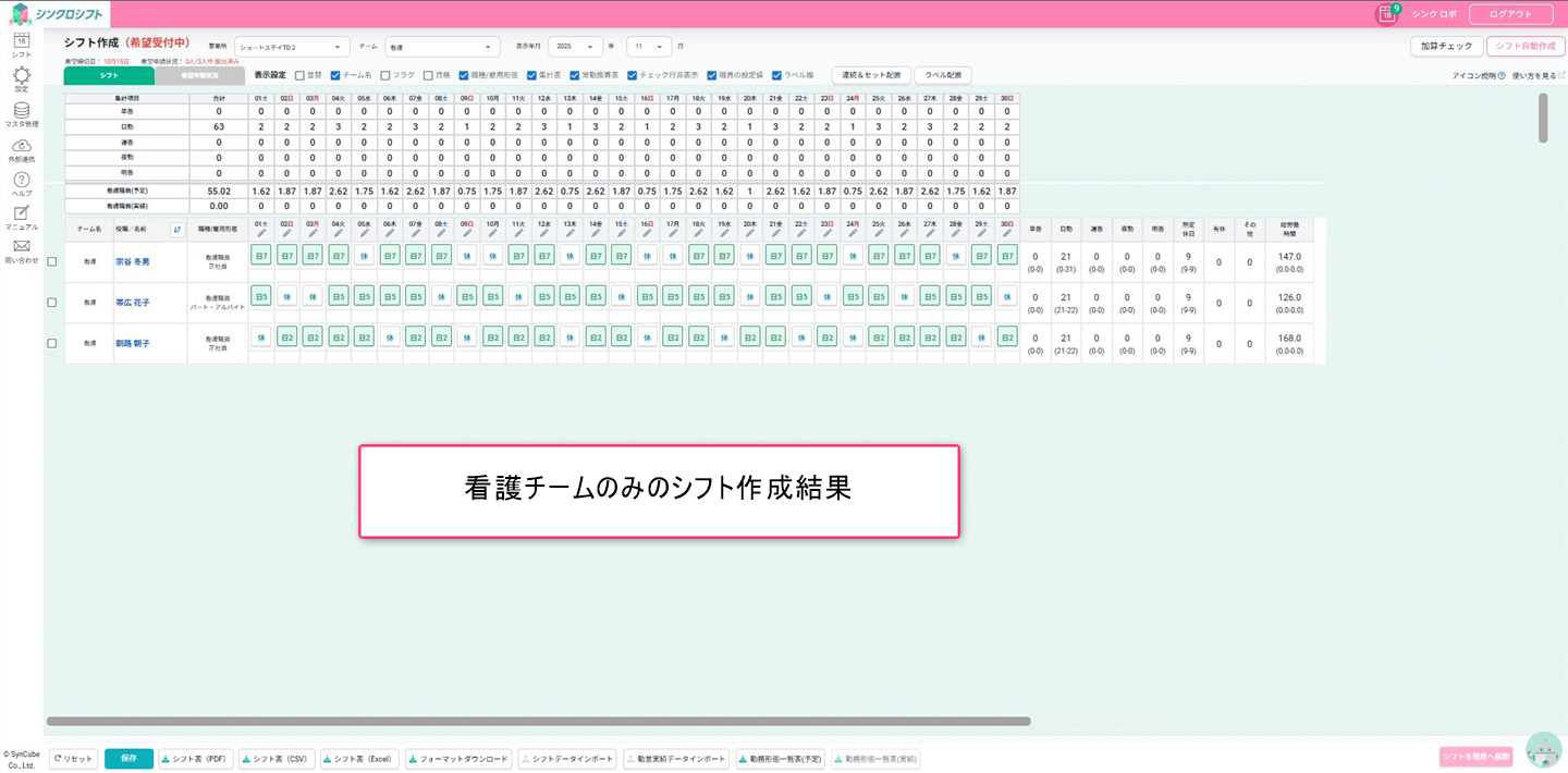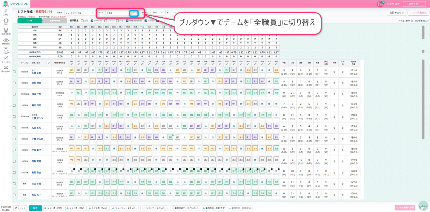 シフト画面上部のチーム切り替えで「全職員」に切り替えて配置結果を確認します。