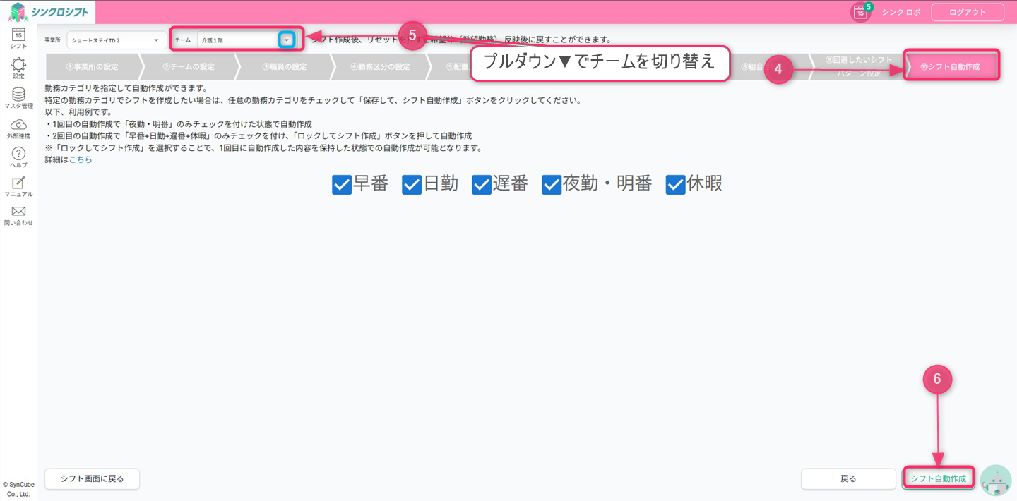「⑩シフト自動作成」をクリックし、画面上部のプルダウンでチームを「介護2階」に切り替えます。