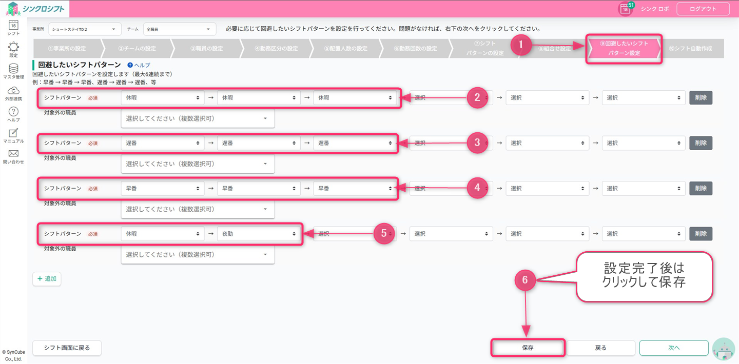 「⑨回避したいシフトパターン設定」の画面で、以下のシフトパターンを回避するように設定します。