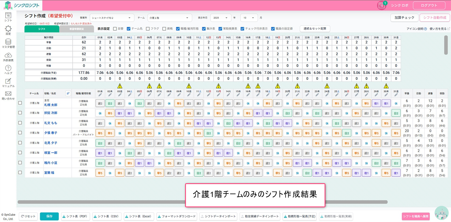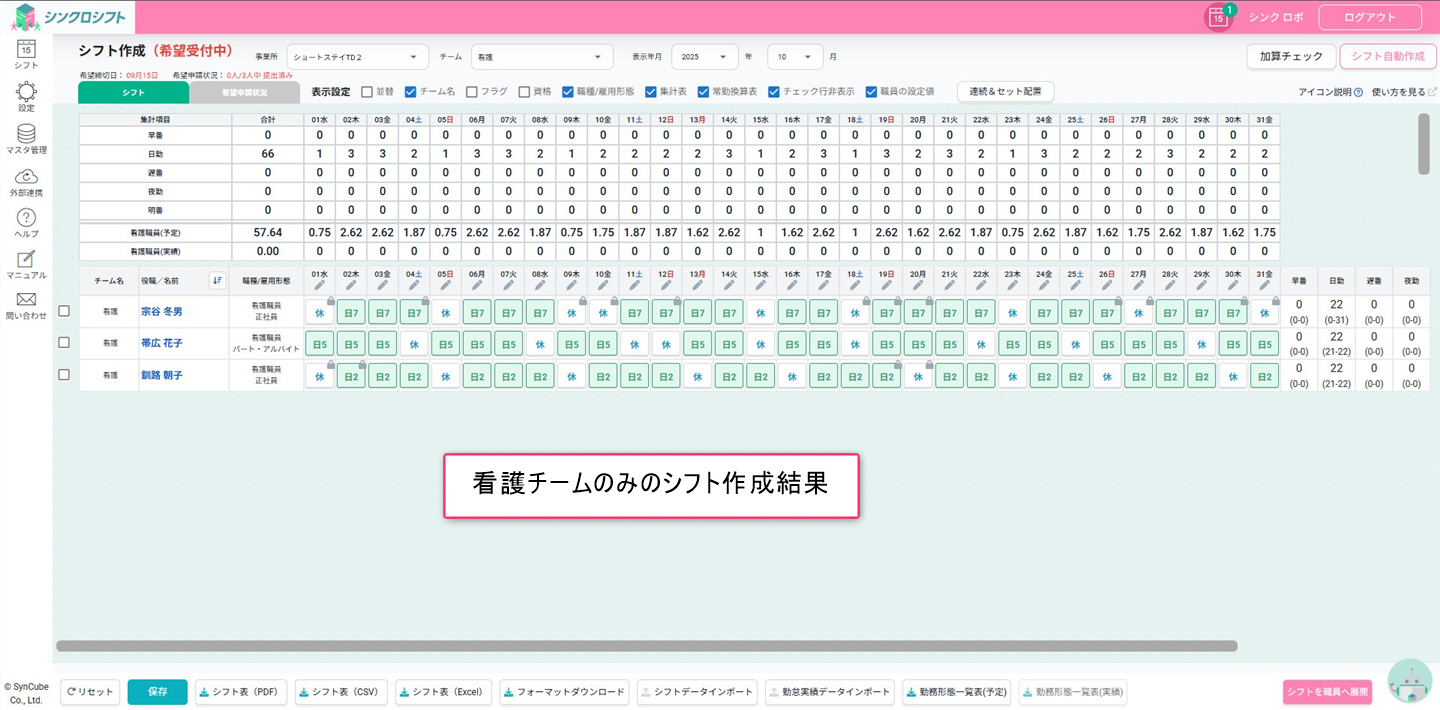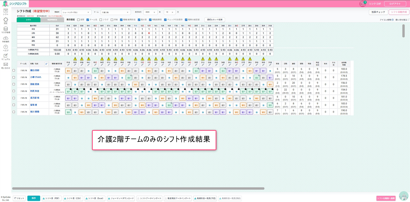 シフト画面上部のチーム切り替えで「全職員」に切り替えて配置結果を確認します。