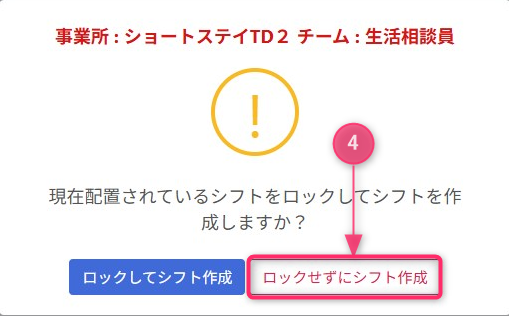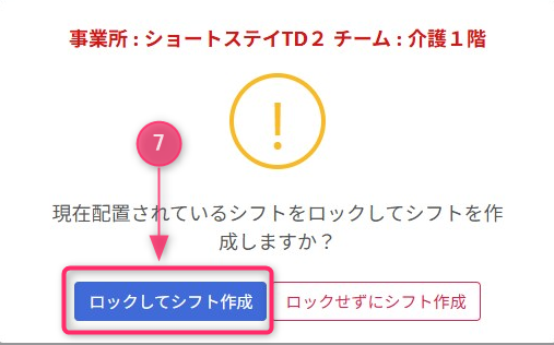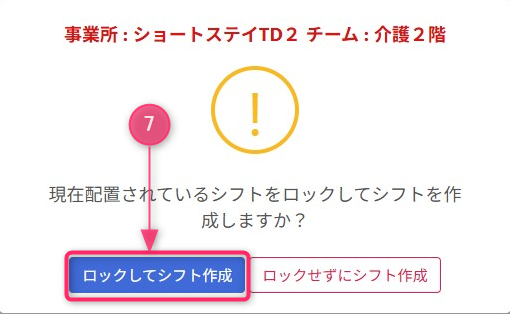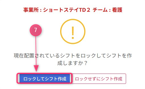 画面左下「シフト自動作成」をクリックし、その後に表示される確認画面で「ロックしてシフト作成」を選択します。
