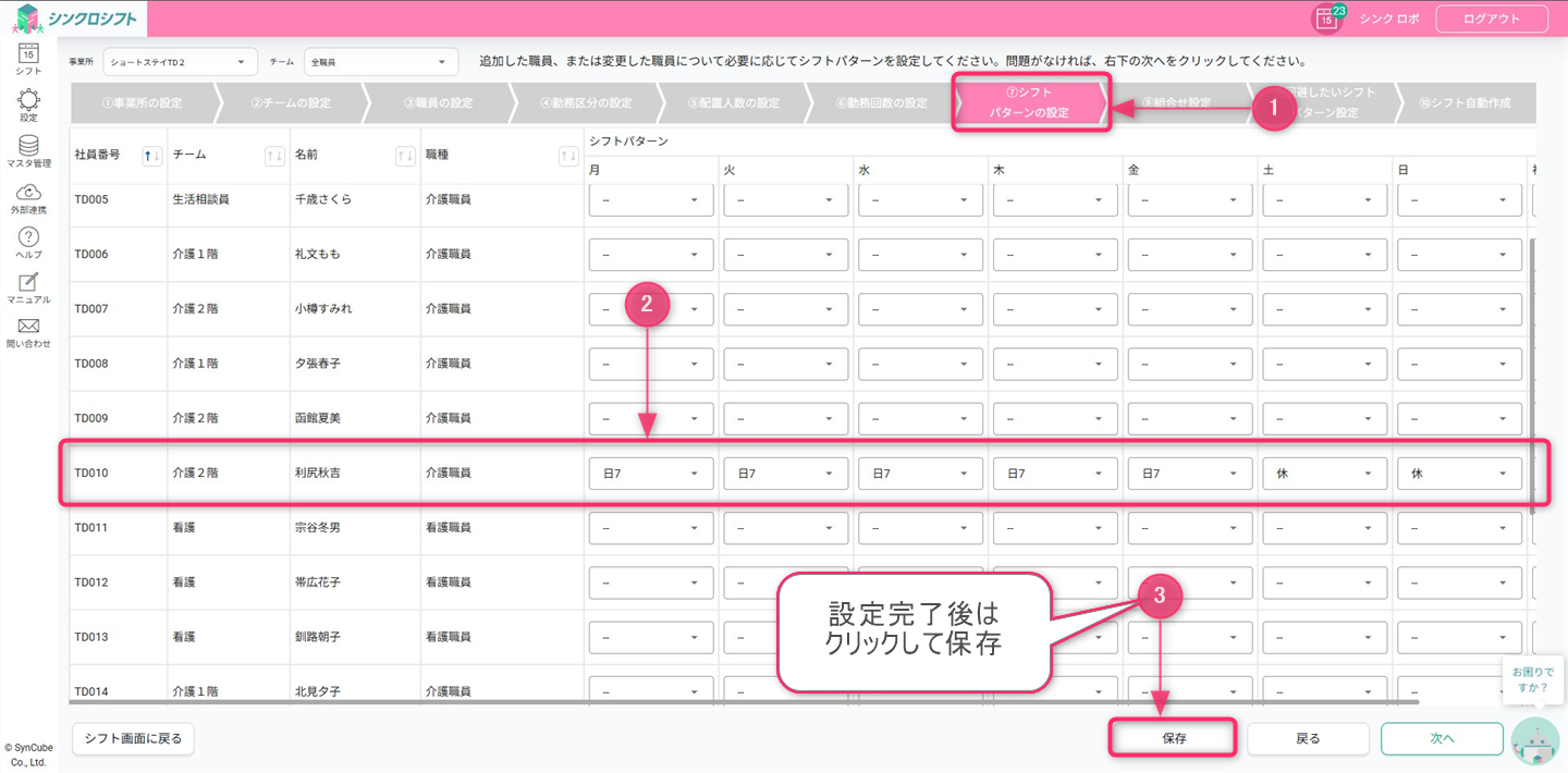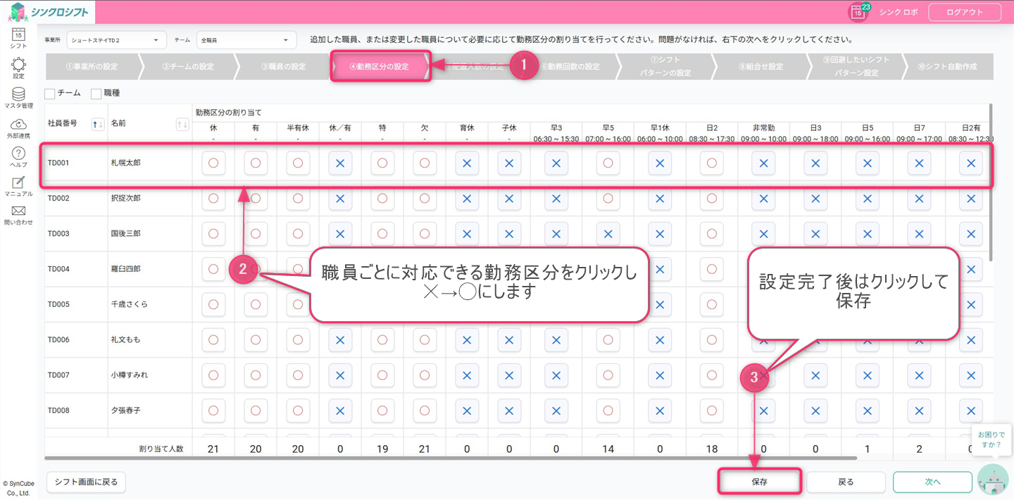 「④勤務区分の設定」画面で職員に勤務を割り当てます。