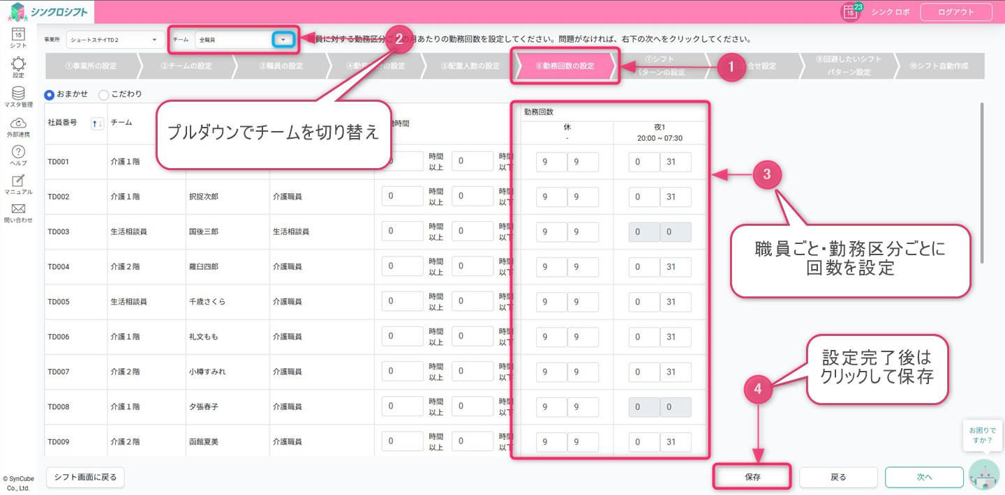シフト自動作成ステップ 「⑥勤務回数の設定」 で、職員ごとの勤務回数を設定します。