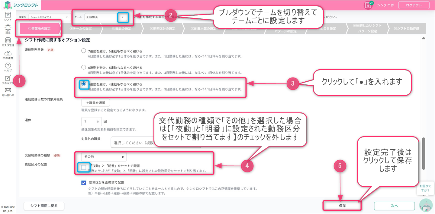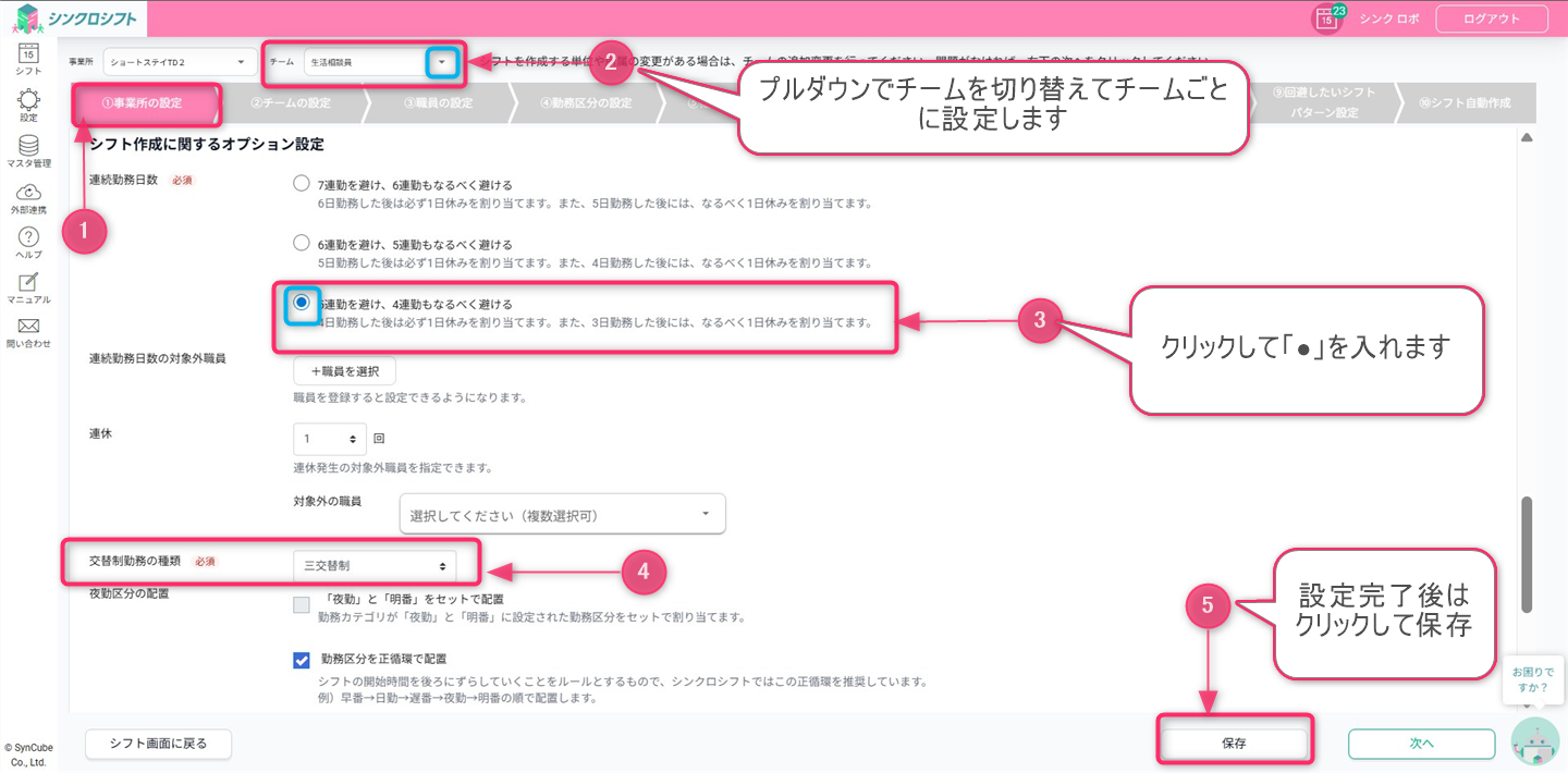 - 連続勤務日数:「5連勤を避け、4連勤もなるべく避ける(5勤務1休)」を選択