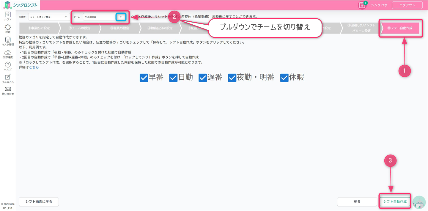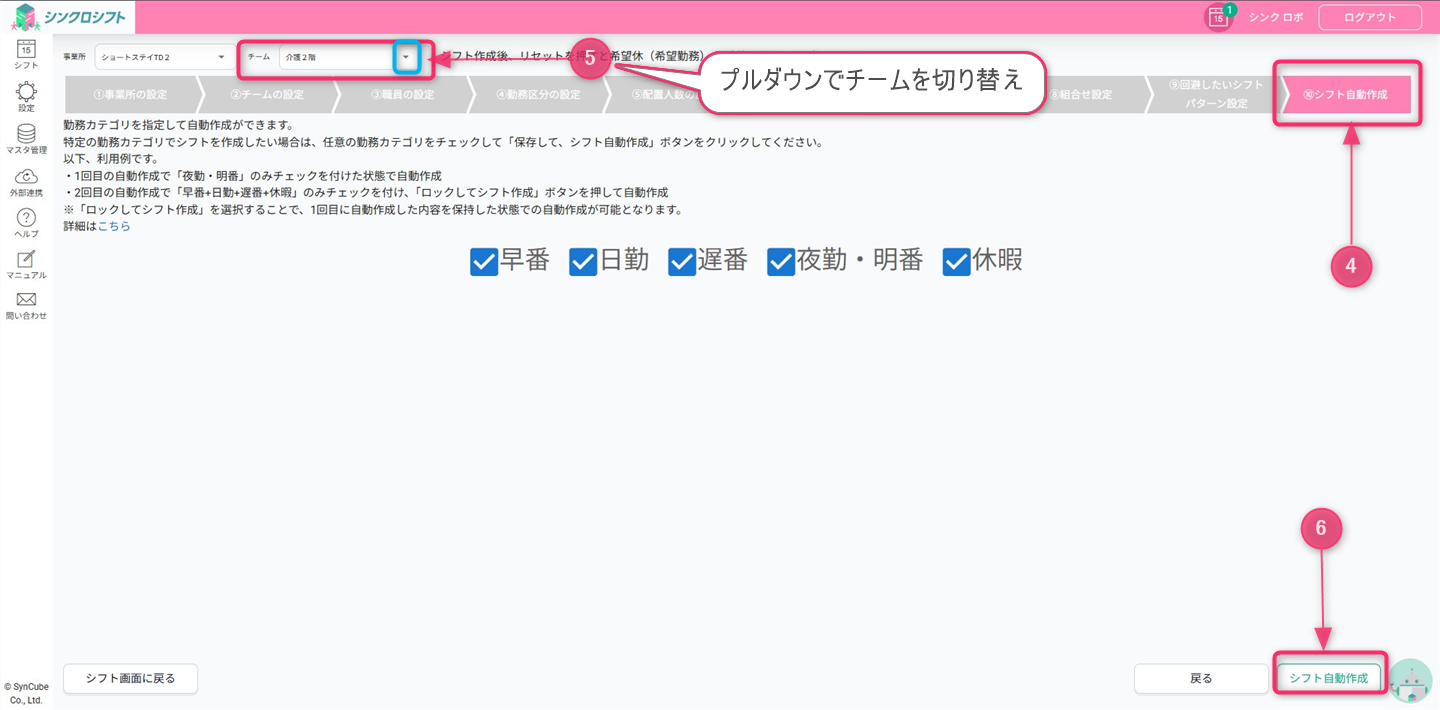 「⑩シフト自動作成」をクリックし、画面上部のプルダウンでチームを「介護2階」に切り替えます。