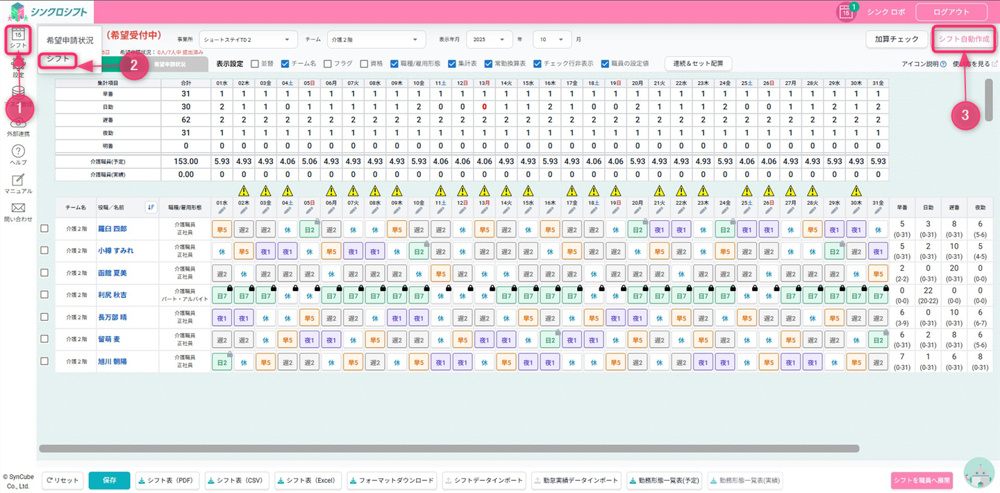 自動作成順序:(1)生活相談員 (ロックしないでシフト作成)→ (2)介護1階(ロックして作成) → (3)介護2階(ロックして作成)→(4)看護(ロックして作成)