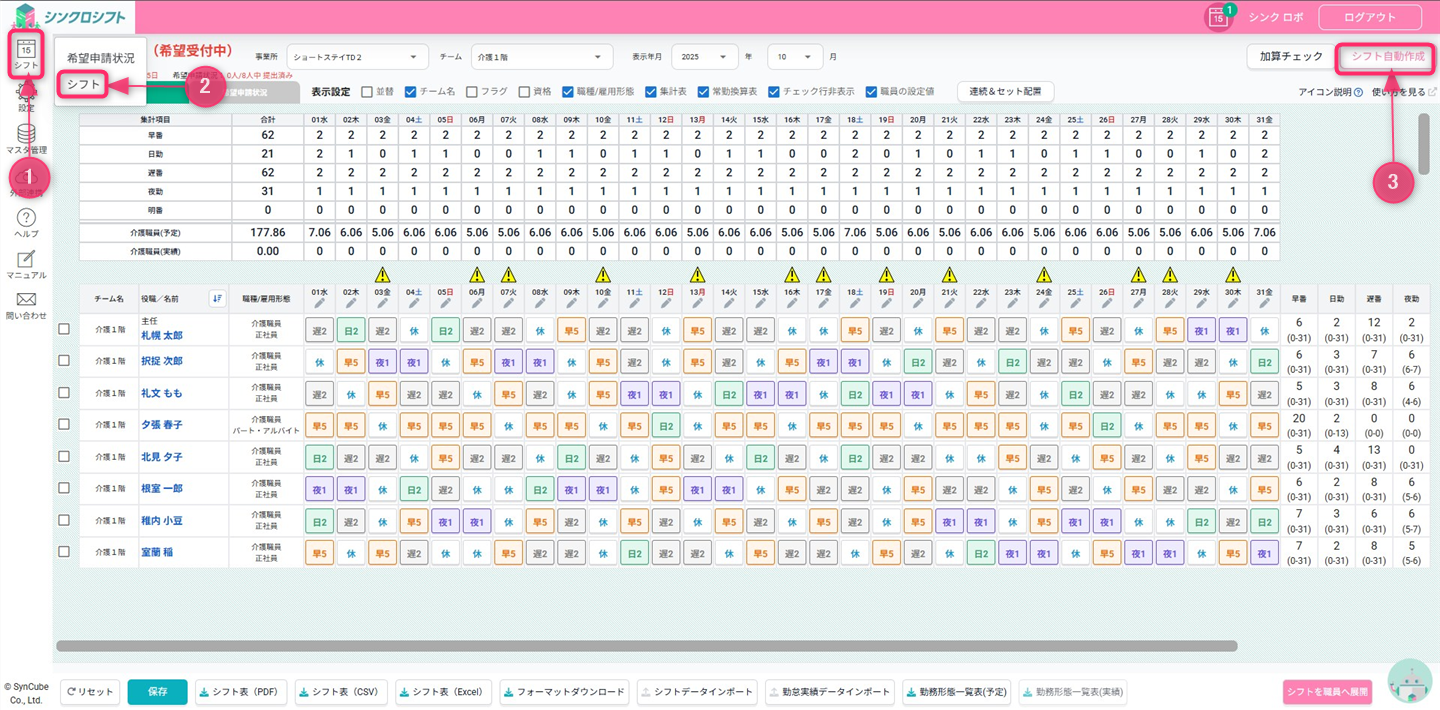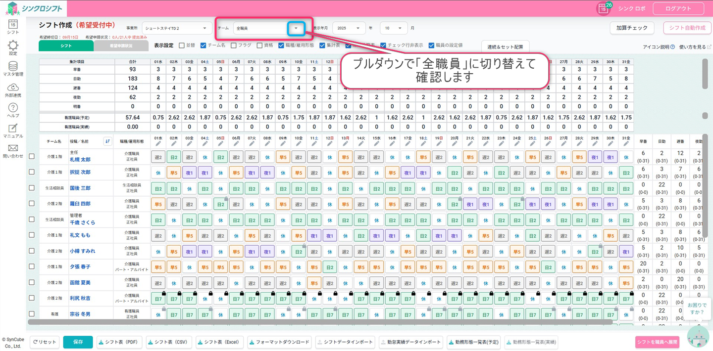 10.表示を「全職員」に切り替えてシフト作成結果を確認