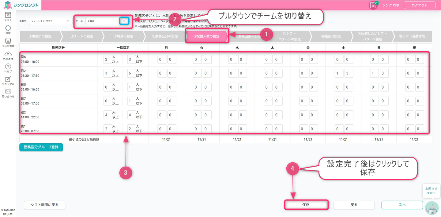 シフト自動作成ステップ 「⑤配置人数の設定」 で、各日ごとの必要人数を設定します。
