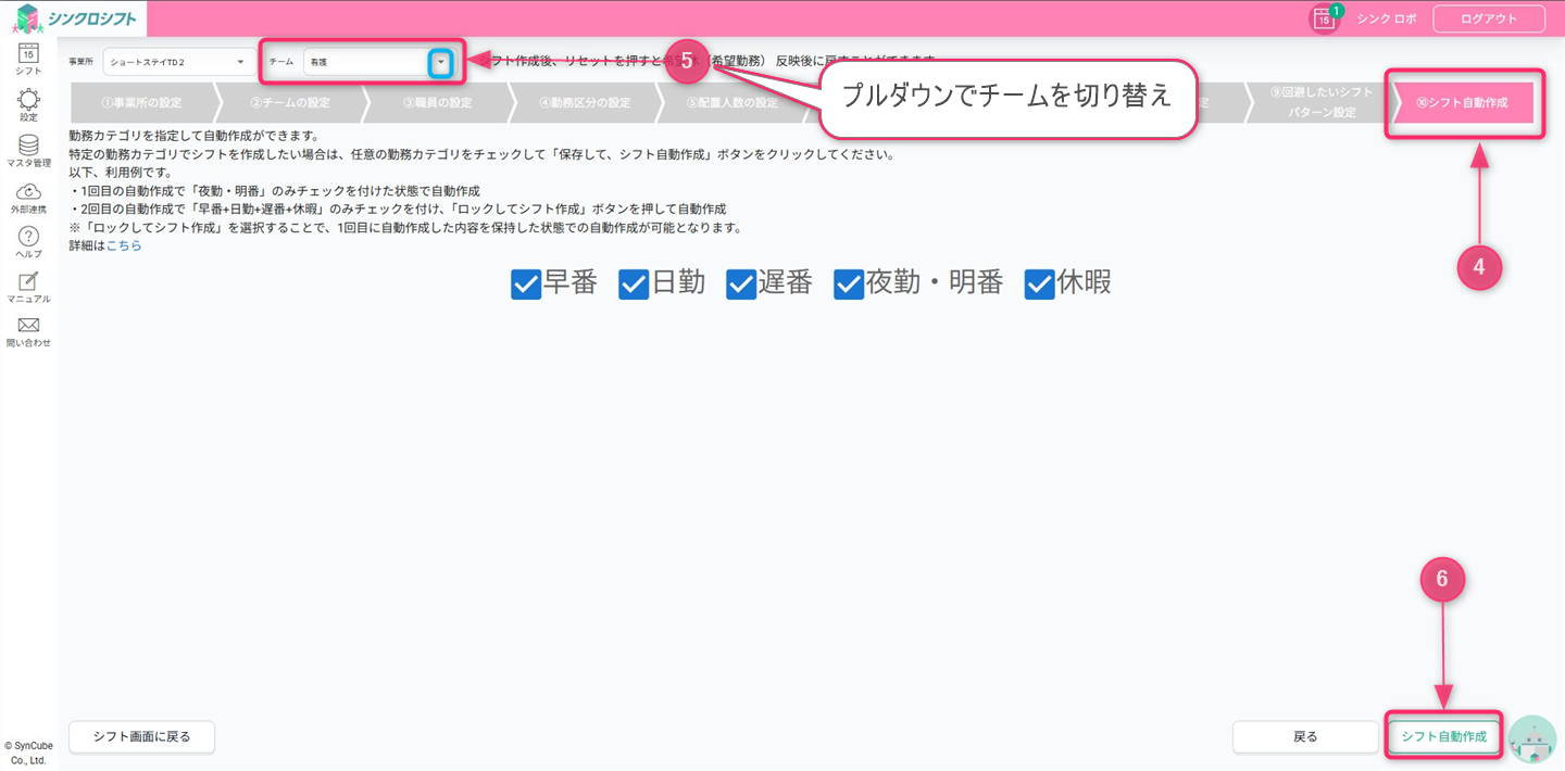 「⑩シフト自動作成」をクリックし、画面上部のプルダウンでチームを「看護」に切り替えます。