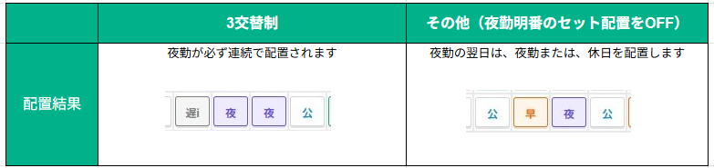 - 「夜勤→夜勤」を確定で配置する場合:3交替制