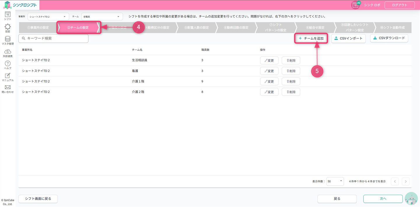 シフト>シフト自動作成>「②チームの設定」の順でクリックし、「チームを追加」選択します。