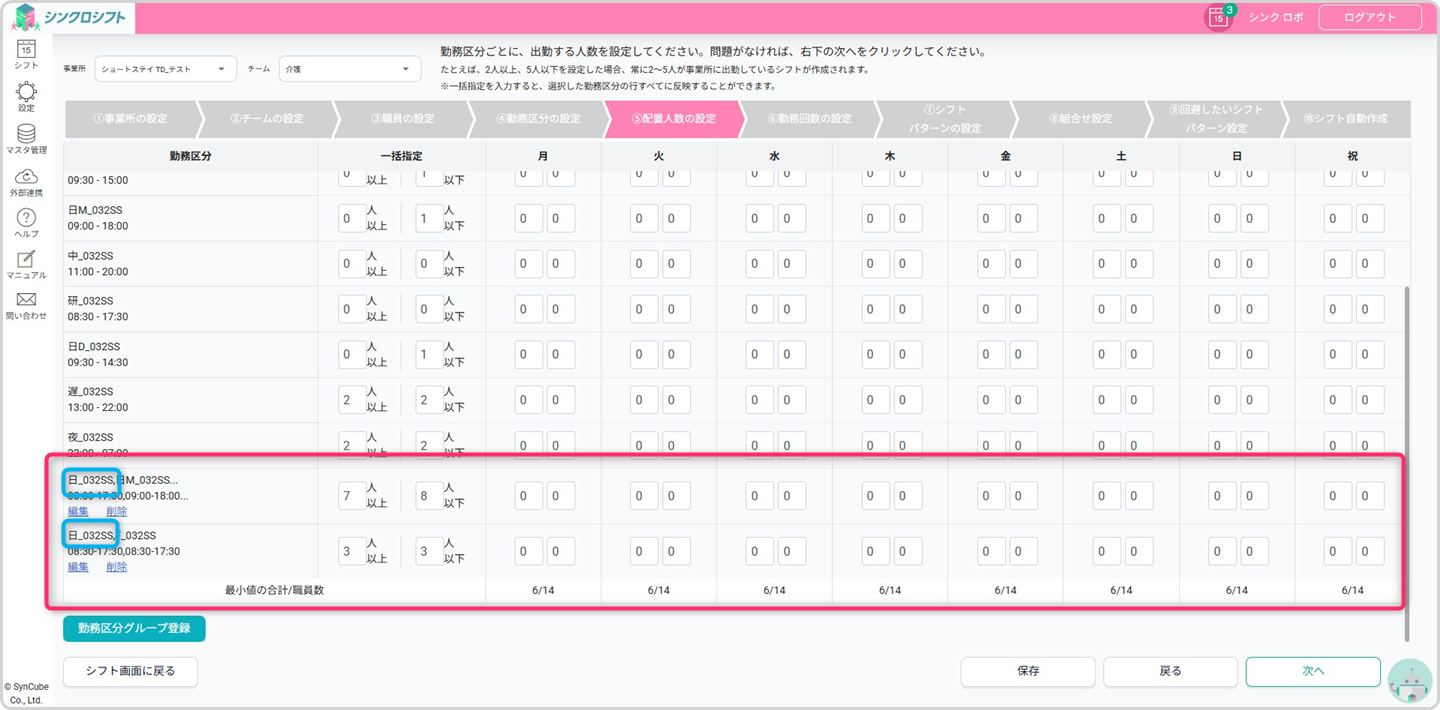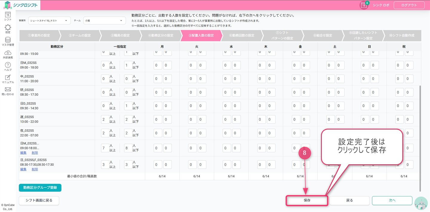 4.その他、必要に応じて公休数が足りない職員が担当している勤務区分の配置人数の設定を見直し、設定完了後はクリックして保存します。
