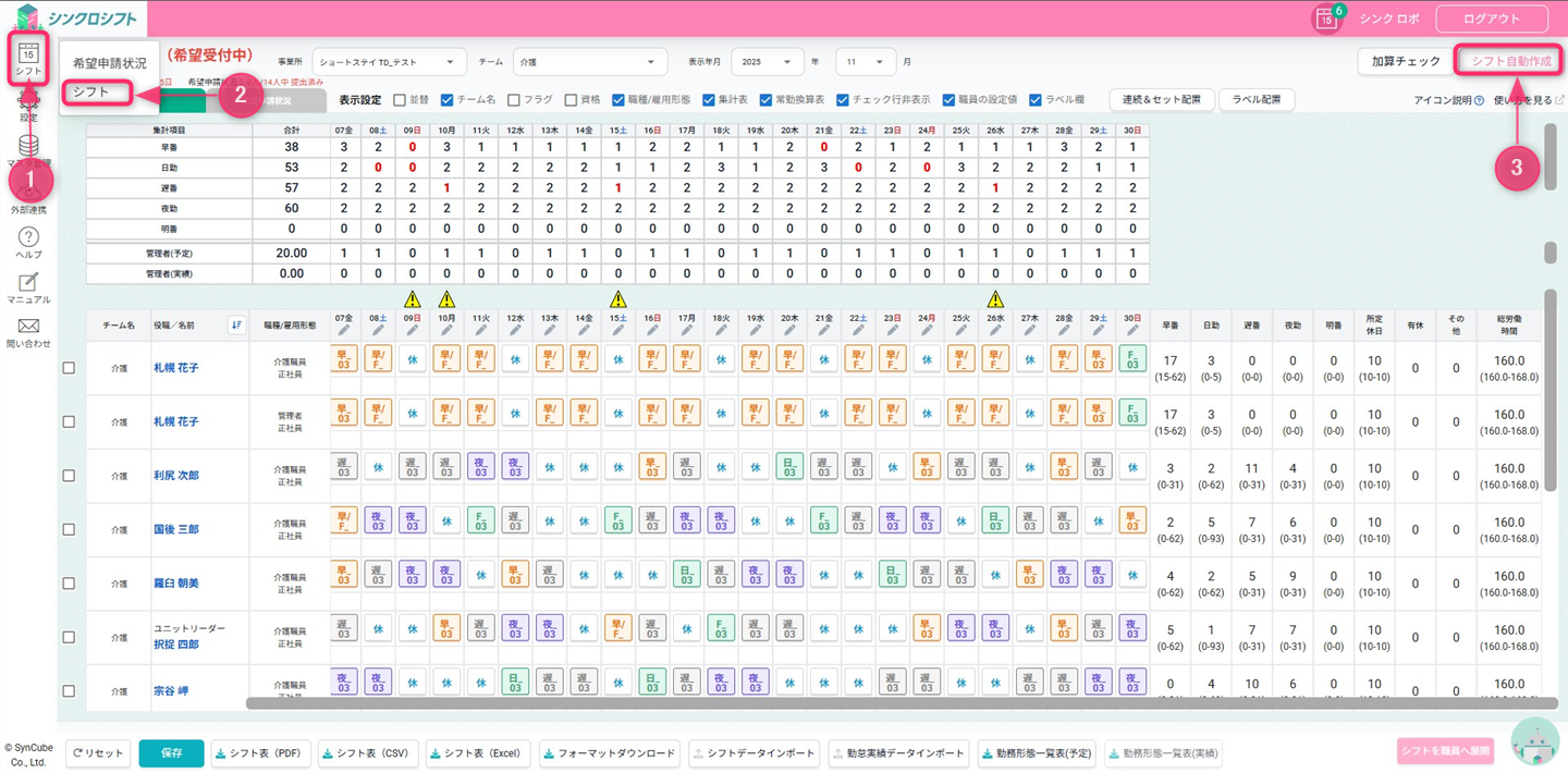 1.シフト>シフト>シフト自動作成の順にクリックします