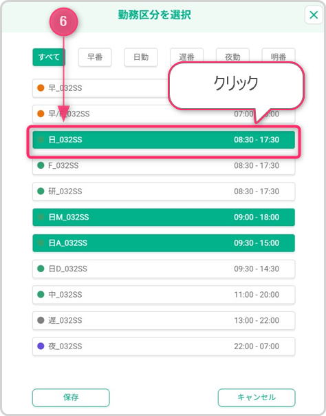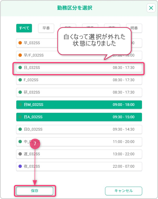 3.勤務区分の選択画面から2つのグループで登録されている勤務区分をクリックして緑色の選択を外します。